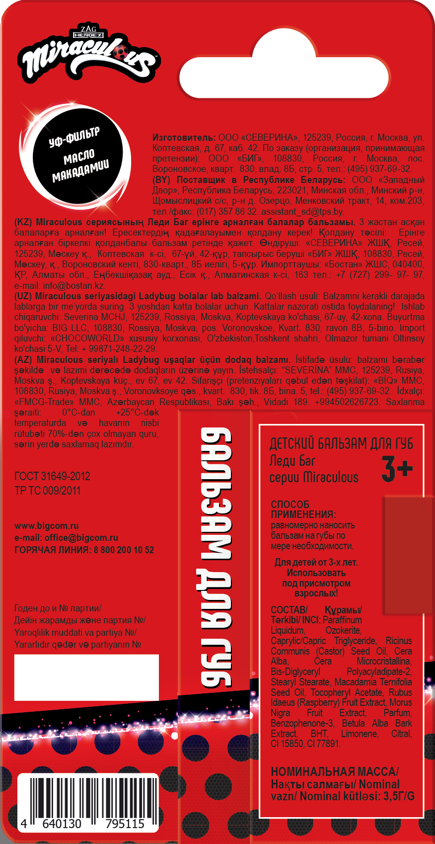 Бальзам для губ придает легкое сияние и обладает соблазнительным конфетно-зефирным ароматом. Он создан специально для маленьких красавиц, поэтому не содержит парабены и обогащен комплексом из масла макадамии, витамина Е и натуральных экстрактов малины и шелковицы, что обеспечивает полноценный уход за нежной кожей губ, защищает и увлажняет ее.
