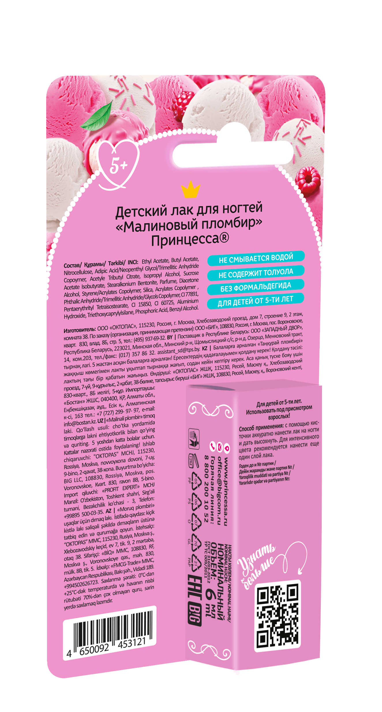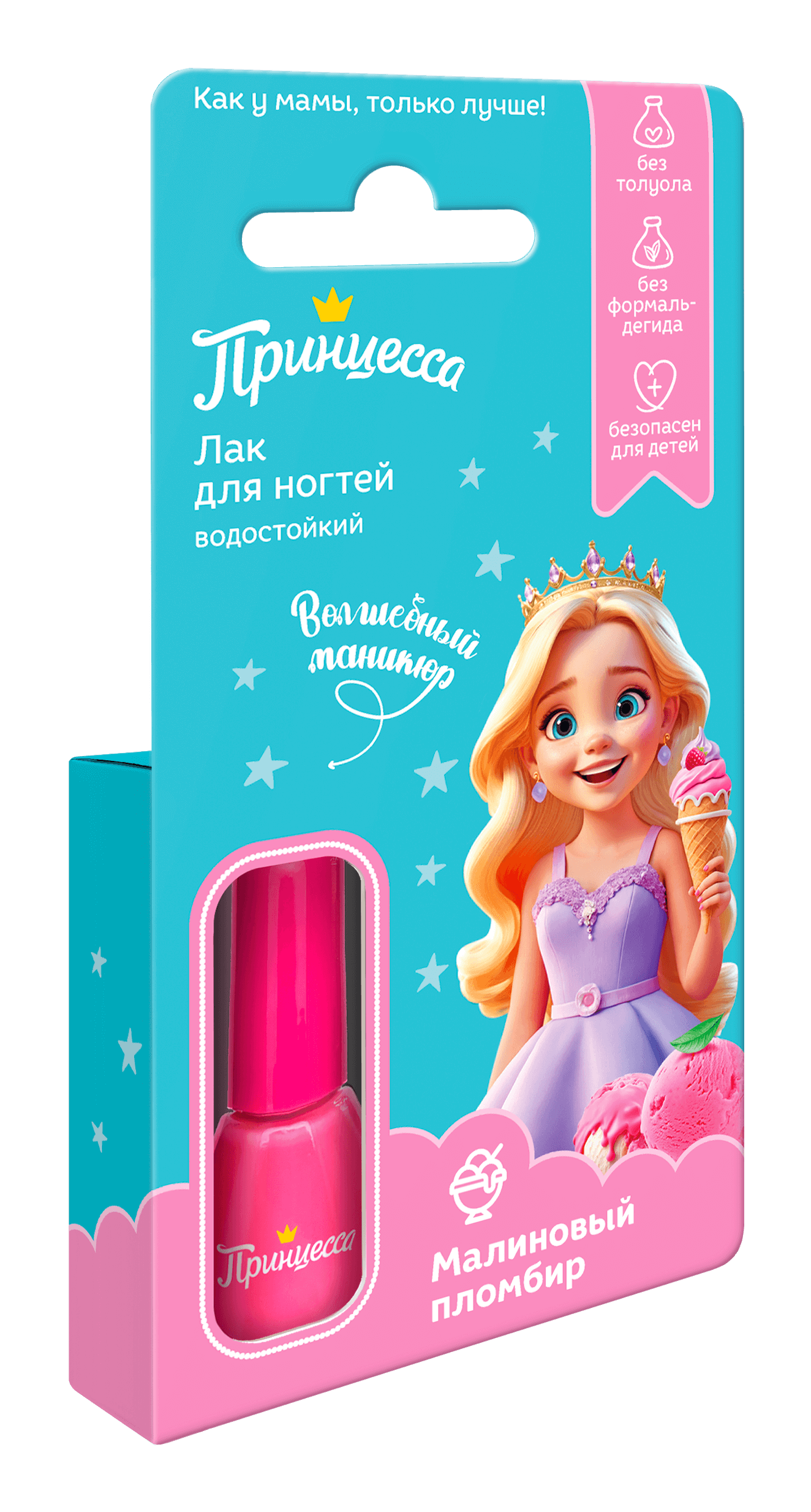 Лак с нежным малиновым оттенком легко наносится и быстро сохнет. Небьющийся стеклянный флакон оснащен удобной узкой и ровной кисточкой, состав разработан специально для девочек, не содержит толуола и формальдегида.